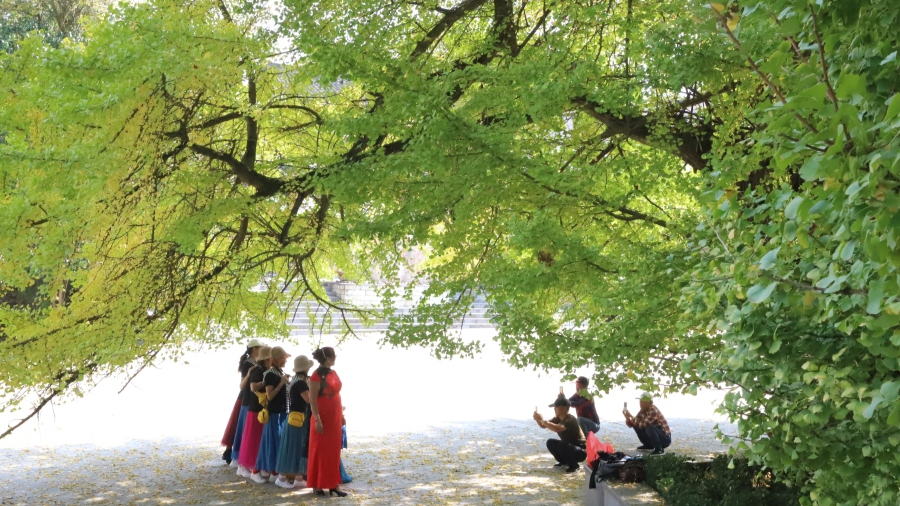 金風(fēng)送爽,草木搖落。時(shí)值深秋,走進(jìn)修文縣六屯鎮(zhèn)大木村金葉廣場,古銀杏群映入游人眼底,把“秋”的符號無限放大。??三株四百余年的古銀杏遮天蔽日,枝葉間不時(shí)有金葉簌簌飄落,靜悄悄滴落地面、亭臺。參天巨樹底下,游客三五成群,歡聲笑語,一波接一波紛至沓來,盡情…
